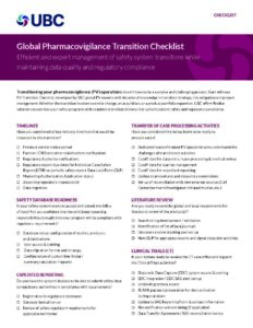 Download our Pharmacovigilance (PV) Service Transition Checklist to mitigate the challenges of changing your safety system. Gain the freedom to optimize your PV program easily with UBC’s full-service, customized solutions, managed by our global PV experts with deep clinical experience and a profound understanding of the rapidly evolving safety landscape. Our specialized multidisciplinary team has decades of knowledge in transition strategy, risk mitigation, and project management to ensure seamless delivery while maintaining data quality and regulatory compliance.